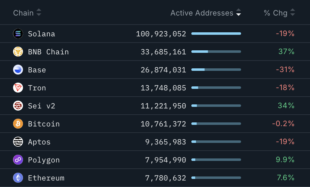 Bu, ana blok zincirleri ile 100 milyondan fazla aktif adrese sahip Solana (sola) arasındaki en yüksek aktif adreslerin artan büyüme oranlarından biridir. Solana, aynı dönemde kullanıcının etkinliğinde % 19’luk bir azalma kaydetti.