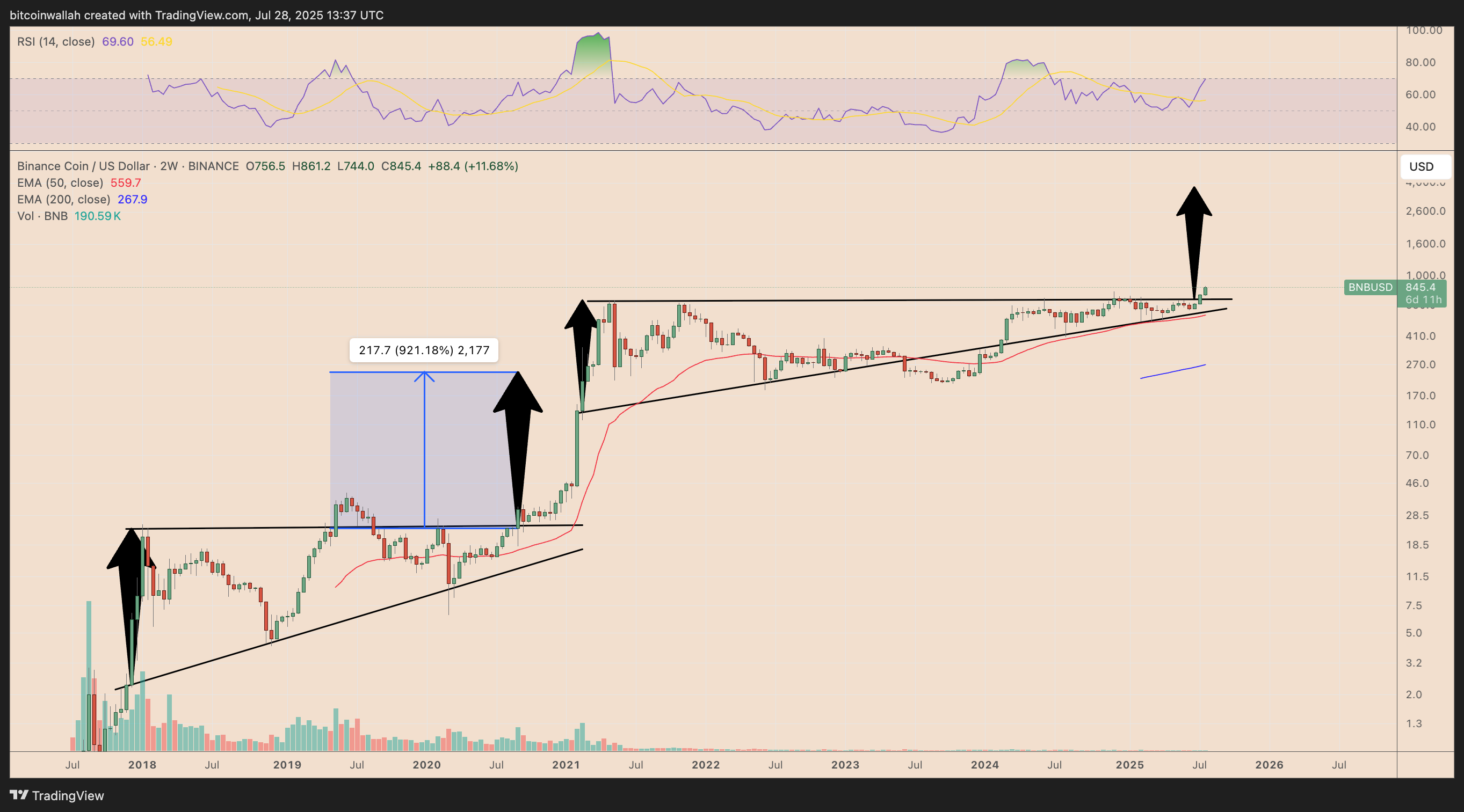 BNB/USD iki haftalık bir fiyat grafiğidir. Kaynak: TradingView